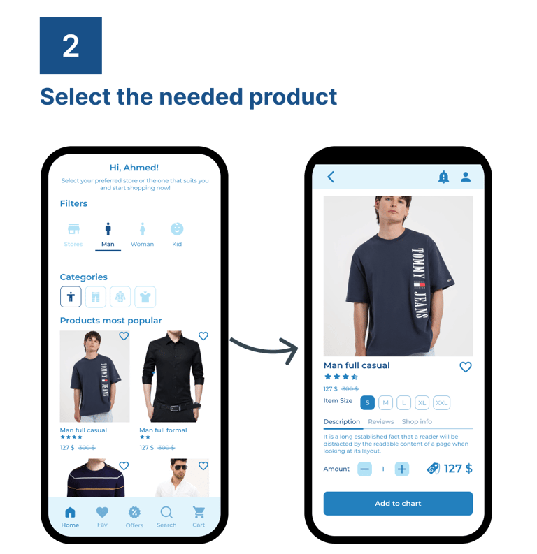 Explore available Stores and select what you need based on the location, stars rate, and the category.